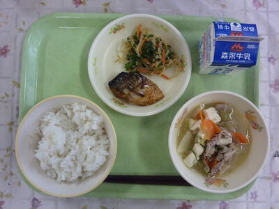 麦ごはん、豚汁、さばのソース煮、ほうれん草のごま和え、牛乳