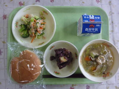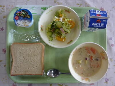 黒糖パン、豆とさつま芋の豆乳スープ、ミックスサラダ、ヨーグルト、牛乳