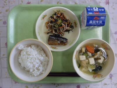 麦ごはん、みそ汁、さんまの甘露煮、ひじきサラダ、牛乳