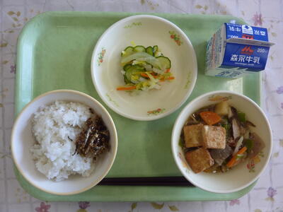 麦ごはん、肉豆腐、切干大根の酢の物、大豆いりこ、牛乳