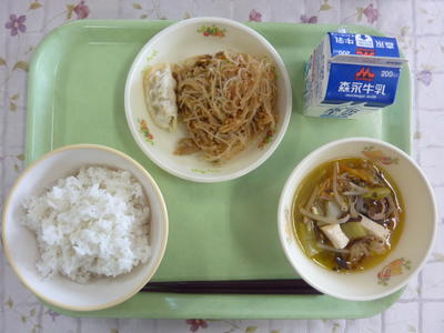 麦ごはん、だごじる、小松菜しらす玉子焼き、菜焼き、牛乳
