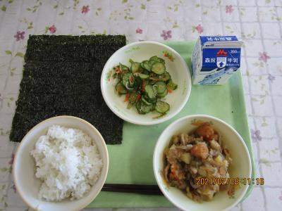 麦ごはん、肉じゃが、きゅうりの酢の物、海苔、牛乳