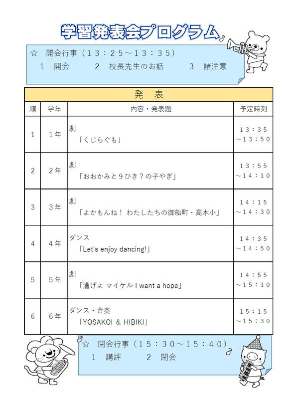 劇、歌、合奏、ダンス等、どの学年も素晴らしい発表ができました。子どもたちの生き生きと頑張る姿を保護者の方々にお伝えできたのではないかと思います。ご参観いただいた保護者の方々ありがとうございました。
