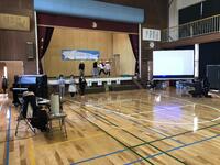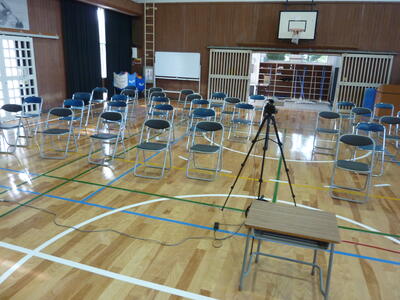 保護者席は体育館の後ろ半分になります。各教室と控室にライブ配信するためのカメラも設置してあります。明日は入れ替え制でご覧いただくことになりますが、控室でもモニターでご覧いただくことができるようにしてあります。