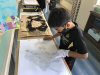 上の写真は2年生の様子です。2年生は刷りを行っていました。教頭先生の指導を受けながら、一人一人順番に真剣な表情で刷り上げていました。