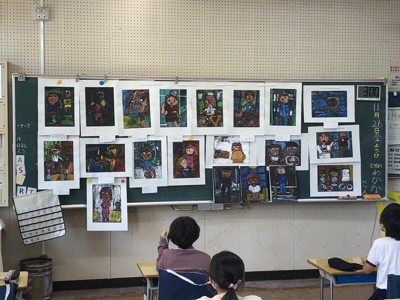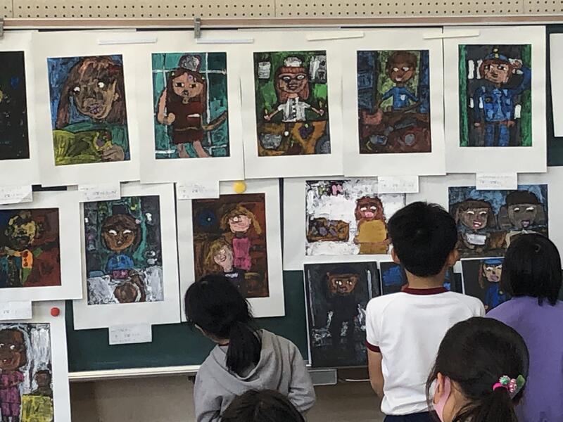 こちらは3年生です。カラー版画が仕上がっていました。お互いの作品を見合って、感想を出し合ったり、それをプリントにまとめたりする「鑑賞」の学習を行っていました。