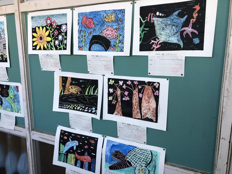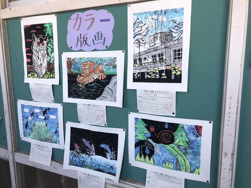 これらは6年生の作品です。もう完全に仕上がっており、教室前の廊下に掲示してありました。3年生と同じカラー版画ですが作り方が違うそうです。