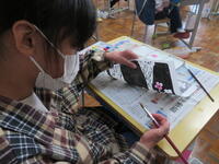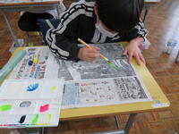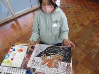黒いインクで刷った裏側から、絵の具で色を入れて仕上げます。時々表に返して、色の具合を確かめながら作業を進めました。