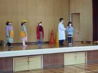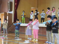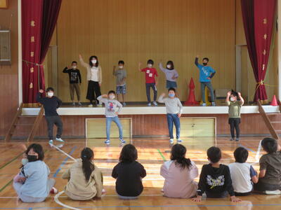 1年生と6年生の交流会が行われました。6年の国語学習の一環で、企画や運営の仕方について話し合ったことをもとに、6年生が進行しました。