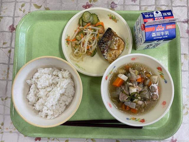 麦ごはん、のっぺい汁、さばの煮つけ、ナッツサラダ