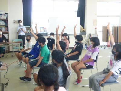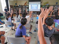 「環境クイズ」に挙手で答える5年生です。前半は「水問題」について学習しました。
