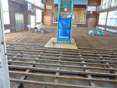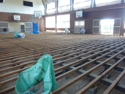 夏休みの期間を利用して、体育館床の張り替え工事が行われています。釘の頭が見えていたり、板が劣化していたりして危険だったための張り替えです。