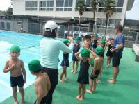 初めて大きなプールに入ります。「冷たい!」「深い」という声をあげながらも、笑顔いっぱいです。全員こわがらずに水に入ることができました。