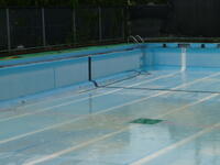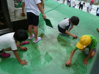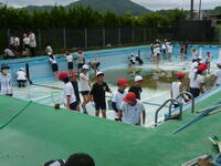 今日、1~3時間目にプール掃除を行いました。まずは、1時間目、3年生がプールサイドやみぞの掃除をしました。1年間使っていないプールには、草や枯れ葉、泥がいっぱい。溝の泥や落ち葉をかきだしてきれいにしました。そして、2,3時間目に4~6年生が、亀の子たわしやデッキブラシで、プールの壁をごしごし。来週から始まる水泳の学習のために、汗をたらたら流しながら、みんなで頑張りました。