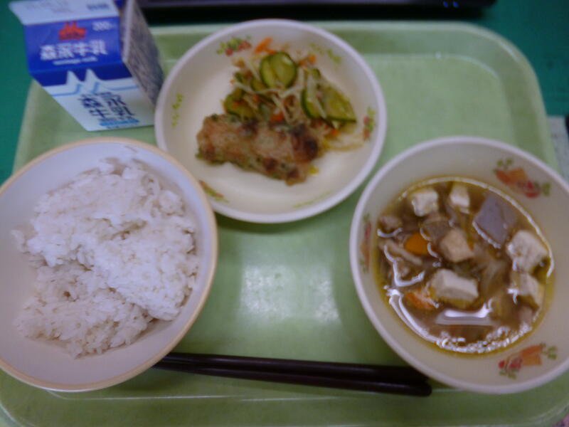 麦ごはん、牛乳、具沢山汁、ちくわの磯辺揚げ、もやしカレーサラダ