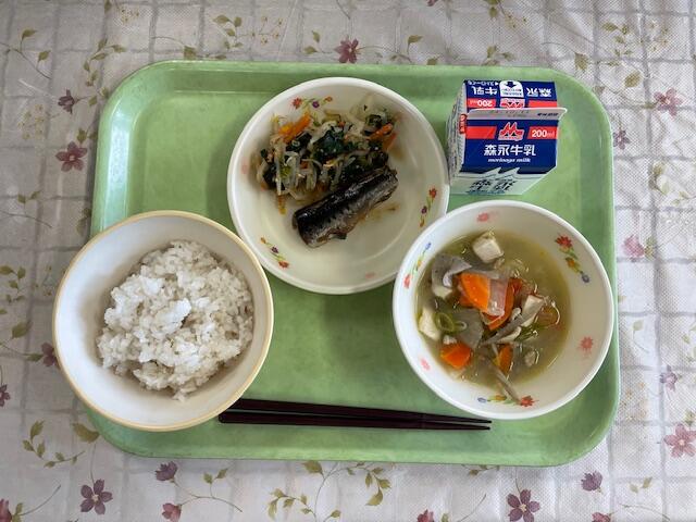 麦ごはん、さつま汁、ほうれん草のごまあえ、いわしの生姜煮