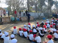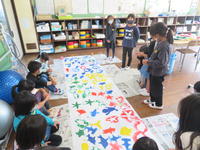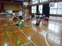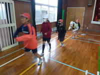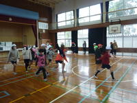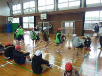 体育館はとても冷えていたので、まずは、太鼓のリズムに合わせてみんなで様々な動きをしながら体を温めました。