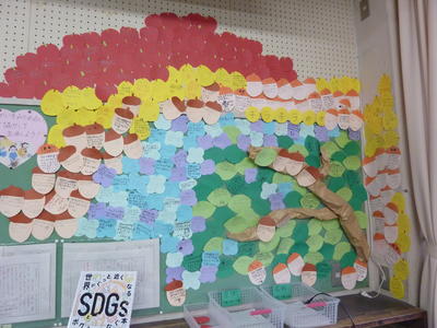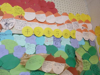 写真は、5年生の「キラリの木」の取組です。ありがとうに限らず、友だちのキラリと光った行動を見つけ、カードに記して掲示してあります。11月の月目標が決まる前からの取組です。
