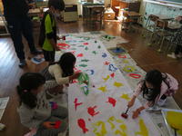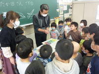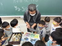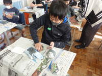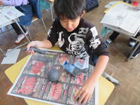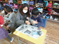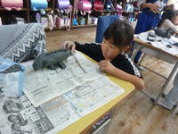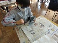 1年生は恐竜づくりに挑戦しました。初めての経験なので、みんな興味津々で参加していました。新聞紙を芯にして作っていく方法を高田さんに教えていただき、みんな頑張って作りました。