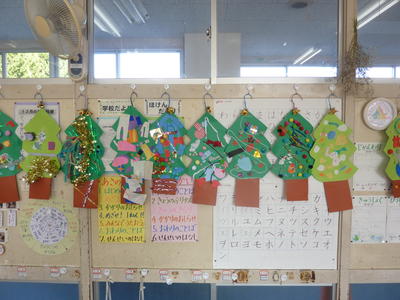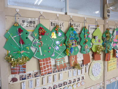 クリスマスが近づき、1年生は図工の学習で、針金ハンガーを使った吊り下げ式のクリスマスツリーを作りました。