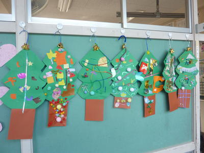 写真のように、思い思いの飾りが付いた素敵なクリスマスツリーが25本でき上がりました。