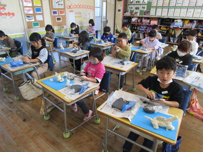 先週、各学年で陶芸教室がありました。高木在住の陶芸家髙田一道さん(一道窯)にご指導をいただきました。粘土ののばし方、形の作り方、部分どうしのくっつけ方など、丁寧に教えていただきました。子供たちは、粘土を丸めたりのばしたりして、思い思いの作品をつくりました。私も2年生に時間に参加し、自分の顔をつくりました(⌒∇⌒)