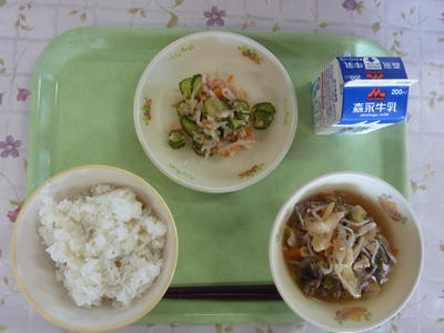 麦ごはん、ポテとんじる、ちぐさ焼き、きゅうりの酢の物、牛乳