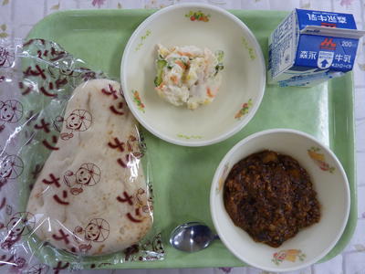 ナン、キーマカレー、ポテトサラダ、牛乳