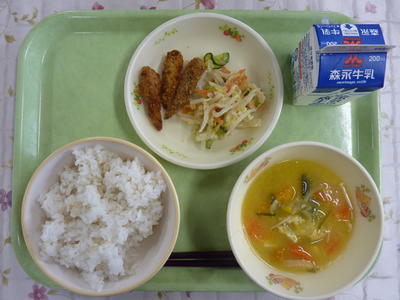 麦ご飯、カボチャの味噌汁、小イワシの梅のか揚げ、ゴマ和え、牛乳