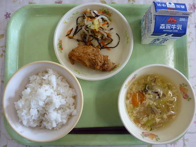 麦ご飯、かきたま汁、鶏肉の唐揚げ、白菜の昆布和え、牛乳