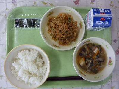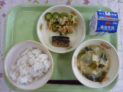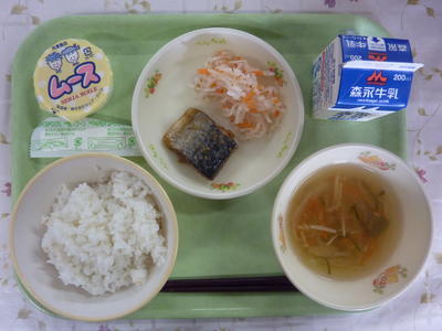 麦ごはん、春雨汁、サバの味噌煮、大根なます、ムース、牛乳