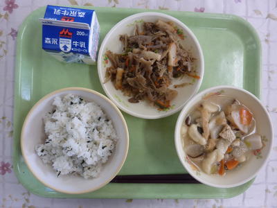 わかめご飯、だご汁、牛肉と根菜のきんぴら、牛乳