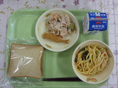 黒糖パン、いろどり野菜のスパゲティー、れんこんツナサラダ、魚のフライ、牛乳