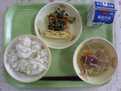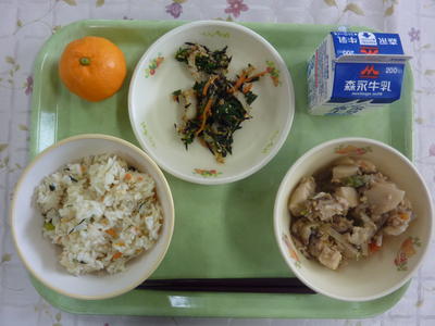 大根めし、里芋のそぼろ煮、白菜のひじき和え、みかん、牛乳