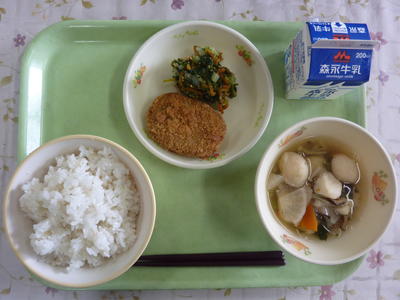 麦ごはん、つみれ汁、豆とかぼちゃのコロッケ、柚子風味サラダ、牛乳