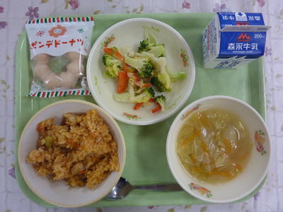 チキンライス、コンソメスープ、キラキラサラダ、ドーナツ、牛乳