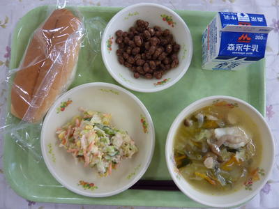 ミルクパン、肉団子スープ、ベジチップサラダ、牛乳