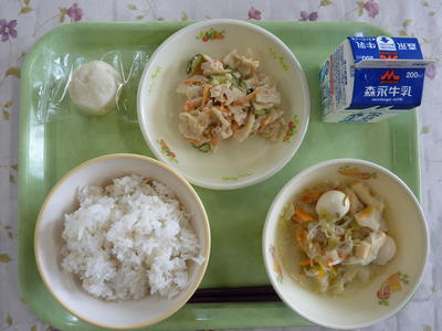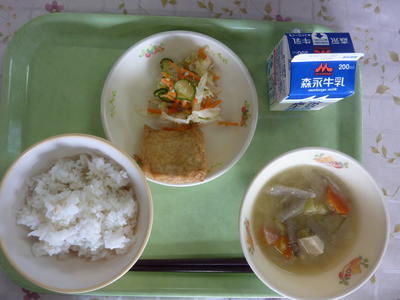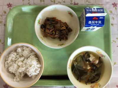 麦ごはん、みそけんちん汁、いわしのトマト煮、春雨の酢の物、牛乳