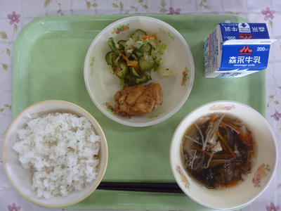 麦ごはん、もずくスープ、ユーリンチー、野菜の梅肉あえ、牛乳