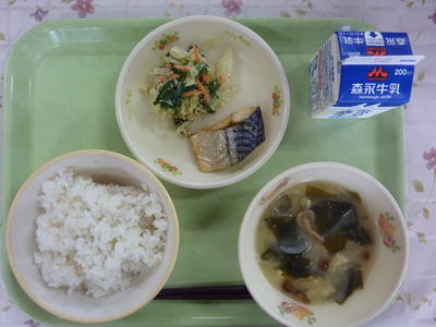 麦ごはん、みそ汁、塩サバ、ささみのごまサラダ、牛乳