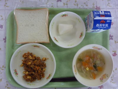 食パン、野菜スープ、チリコンカン、梨、牛乳