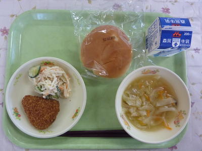 食パン、オニオンスープ、メンチカツ、ひじきサラダ、牛乳
