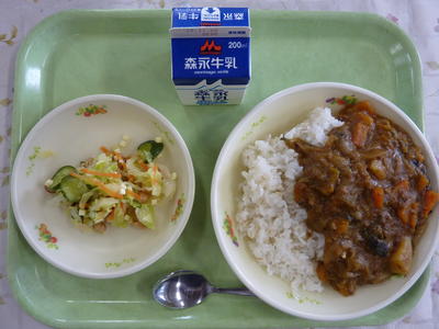 ビタミンAたっぷりカレー、かみかみチーズサラダ、牛乳