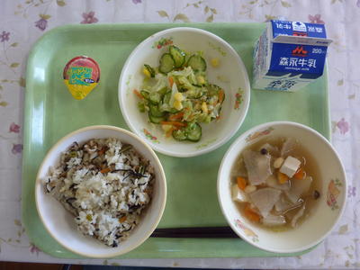 ひじきご飯、イチョウはじる、ごま酢和え、ピーチゼリー、牛乳