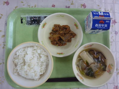 きびご飯、じゃがいものそぼろ煮、きびなごのカリカリフライ、ピーマンの昆布和え、牛乳