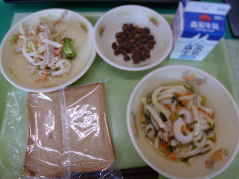 黒糖パン、牛乳、煮込みうどん、大根サラダ、ココア豆