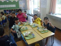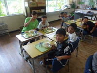 昨日(6/17)、本校に町給食センターの所長さんと調理員さんが来校されました。給食の時間に来られ、各教室で子供たちと一緒に給食を食べられました。
