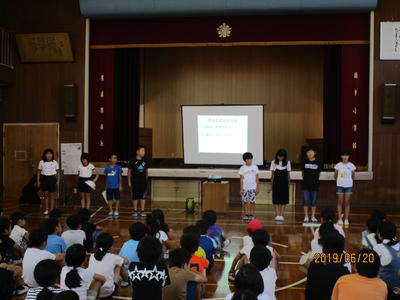 先日(6/20)に児童集会が行われました。今回は環境委員会からの発表でした。
