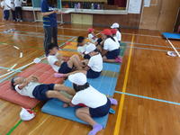 3・4年生は、自分たちで移動し自分たちで数えます。上体起こしと長座体前屈に挑戦している様子です。