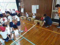 1年生にとっては初めての経験なので、6年生と一緒に取り組みます。6年生は1年生と手をつないで移動し、1年生の挑戦回数を数えてくれています。5年生は2年生と一緒に取り組んでくれました。